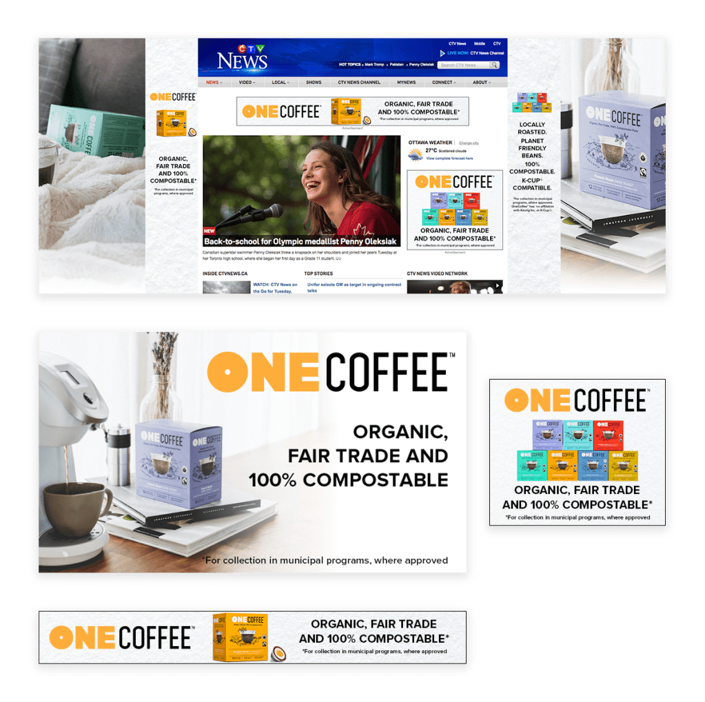 A promotional campaign for OneCoffee, including motion graphics and a logo animation for a commercial spot and various online ads.