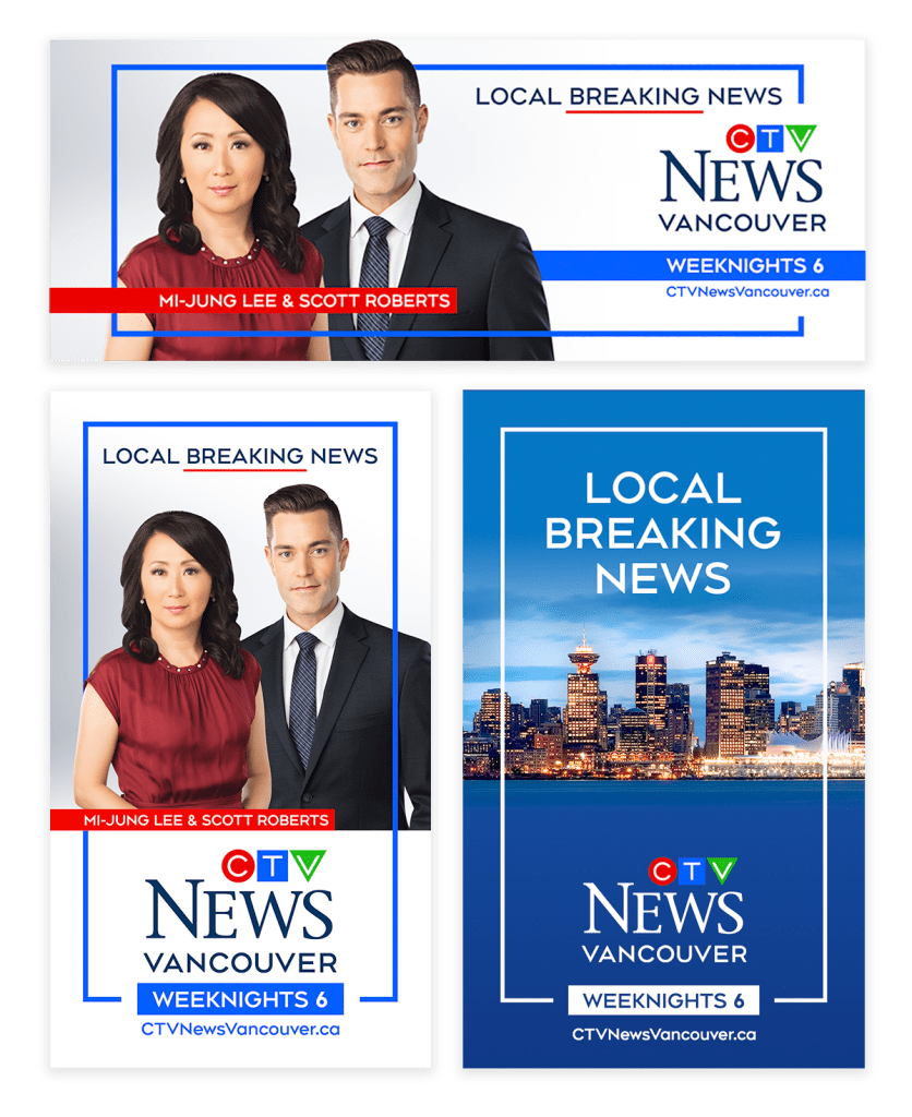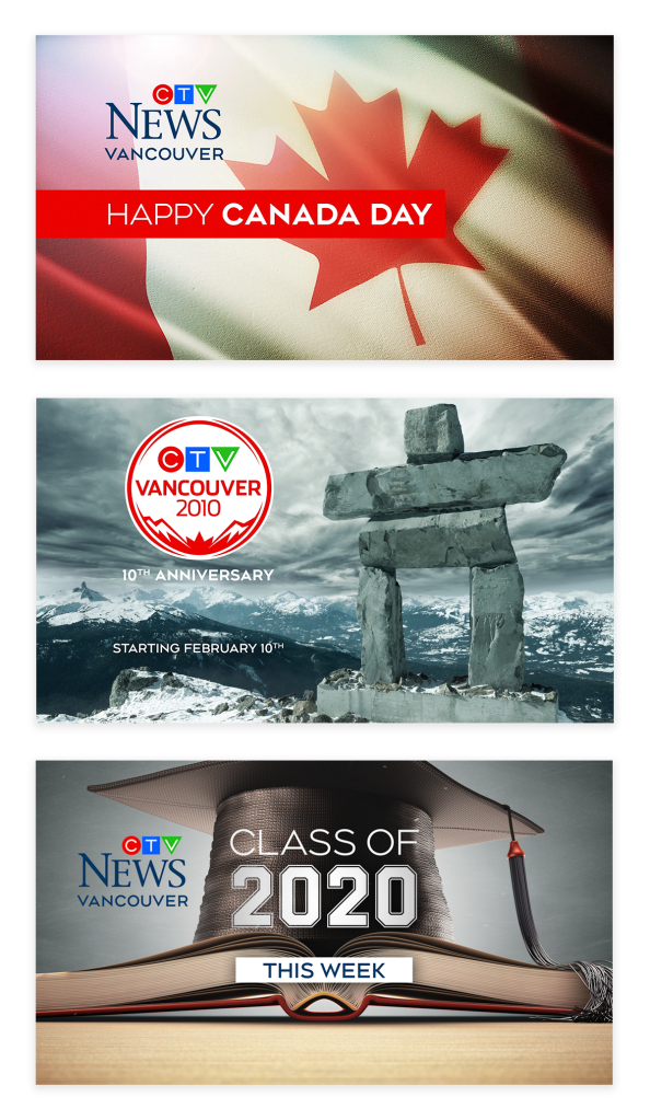 As Senior Graphic Designer at CTV Vancouver, I was responsible for adapting the CTV brand to a wide range of different formats and platforms. This included designing and prepping files for outdoor signage such as bus shelters or billboards, digital billboards, magazine advertisements, bus wraps and promotional material. I also created mobile app graphics for a variety of devices as well as station identities that promoted feature stories or events on our newscast.